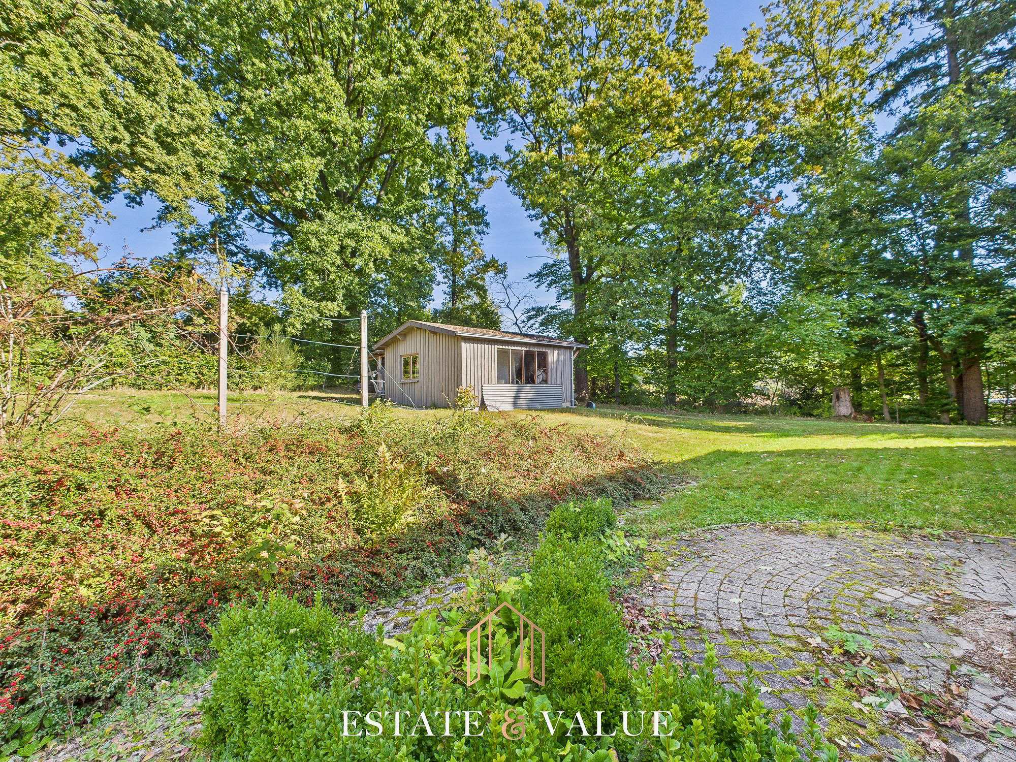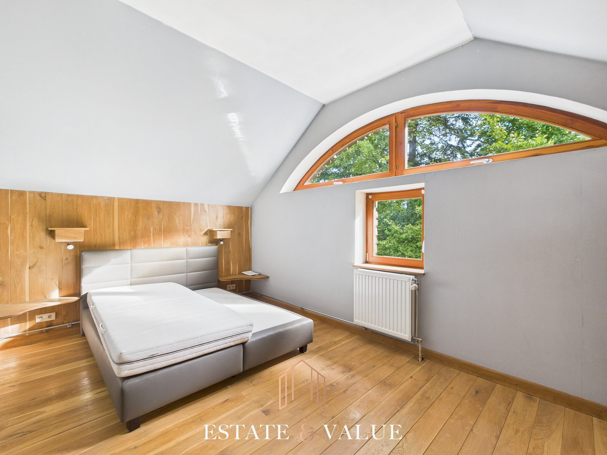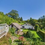 Quatre caves avec salle de douche et toilette, un double garage avec portes sectionnelles motorisées, un vaste jardin arboré et une belle terrasse en pierre complètent cette charmante propriété.