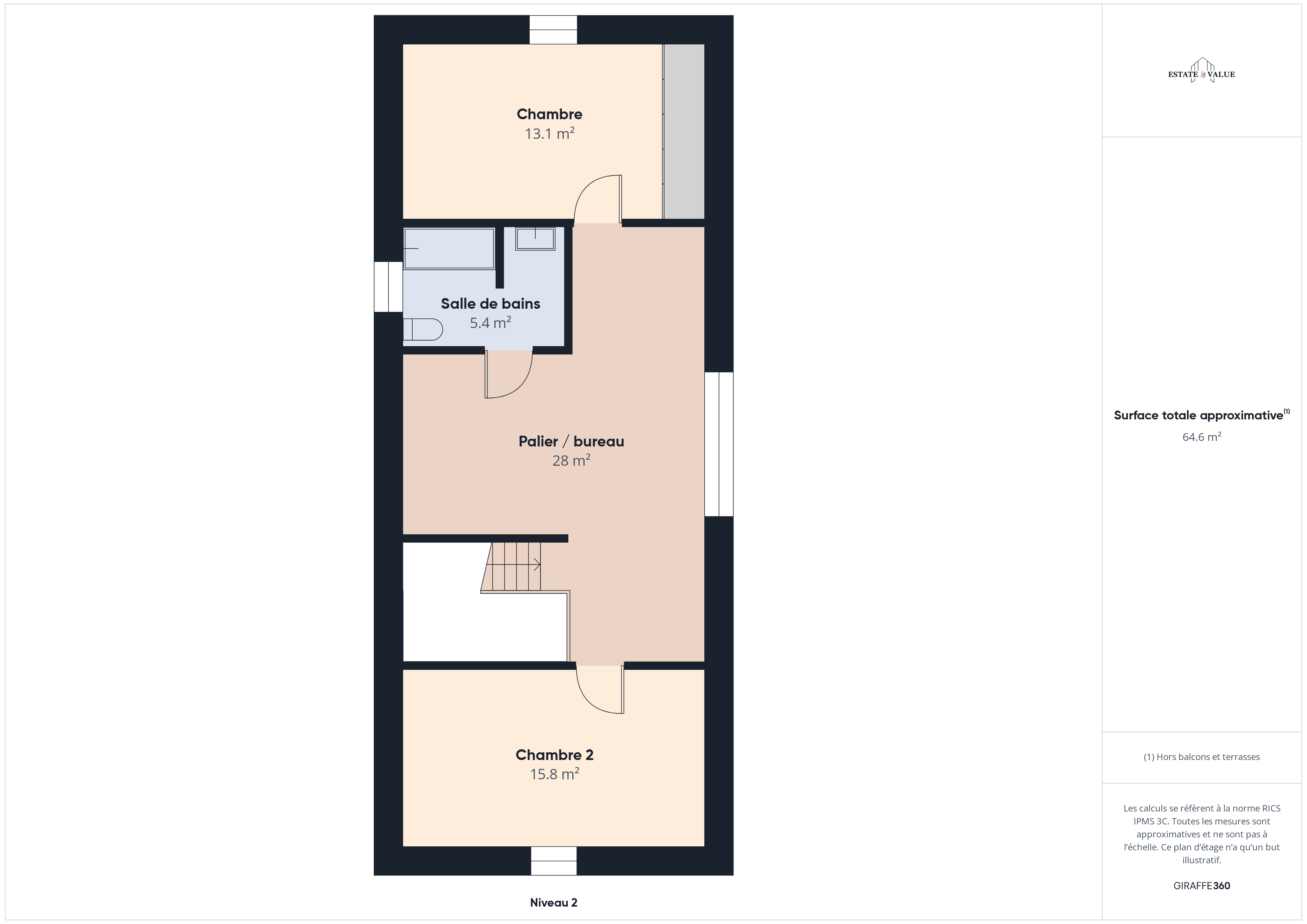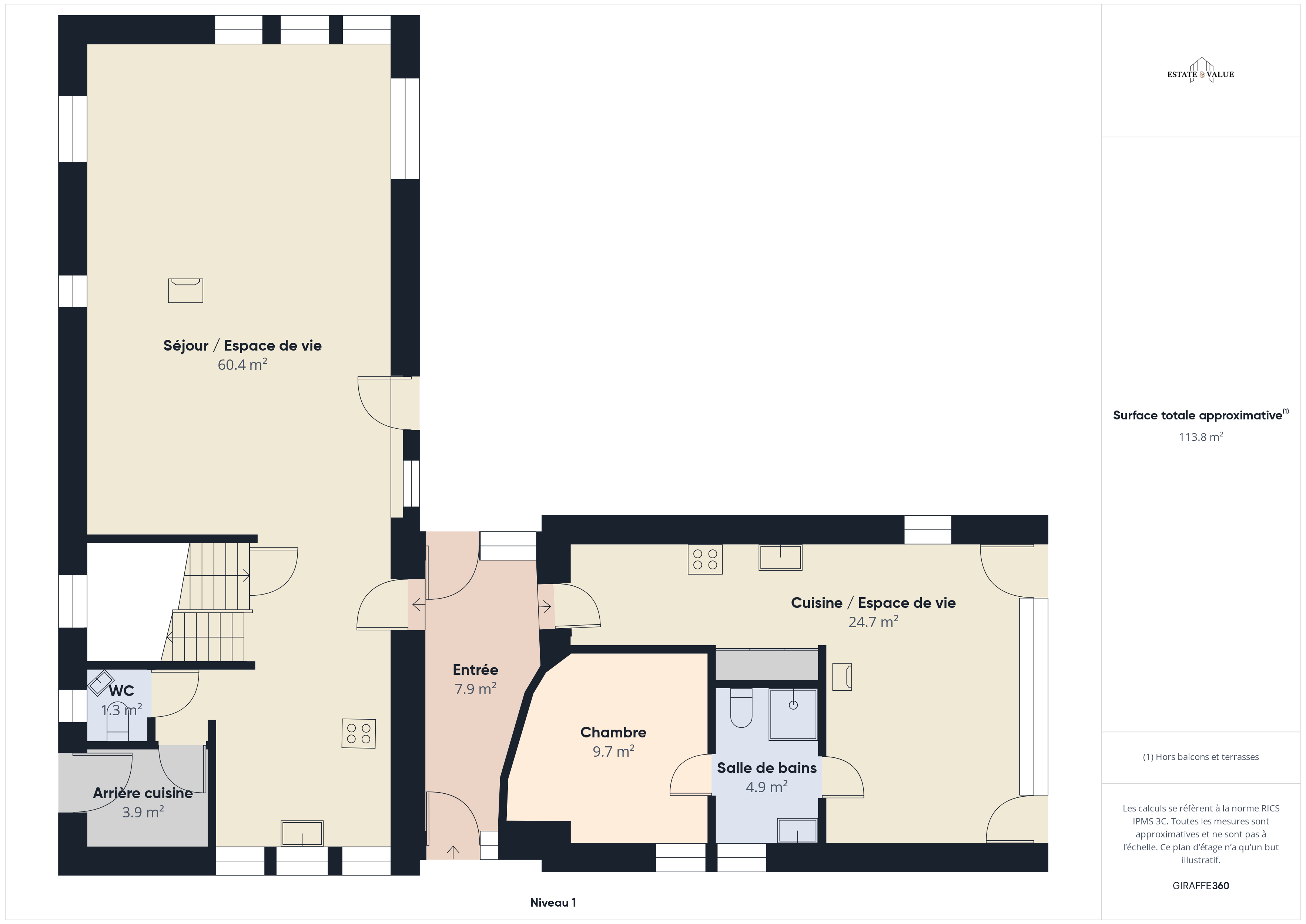 La partie principale dispose d’un vaste séjour (60 m²) très lumineux avec un foyer à bois, d’une cuisine équipée, d’une buanderie et d’une toilette invité. À l’étage se trouvent une spacieuse mezzanine idéale pour un bureau ou un espace lecture, deux chambres et une salle de bain.