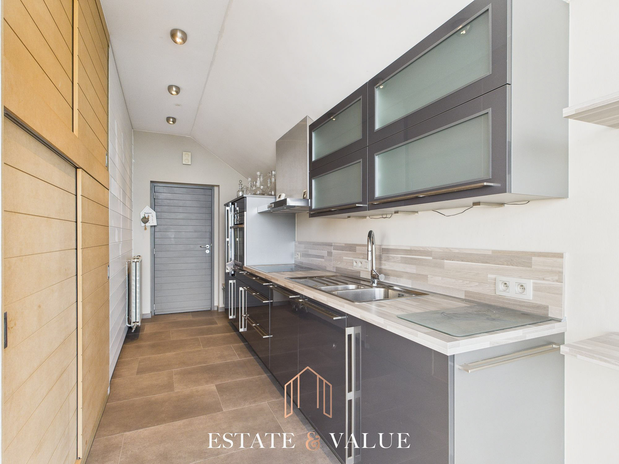 L’autre partie se compose d’un séjour inondé de lumière dominant la nature environnante, d’une seconde cuisine, d’une chambre et d’une salle de douche.