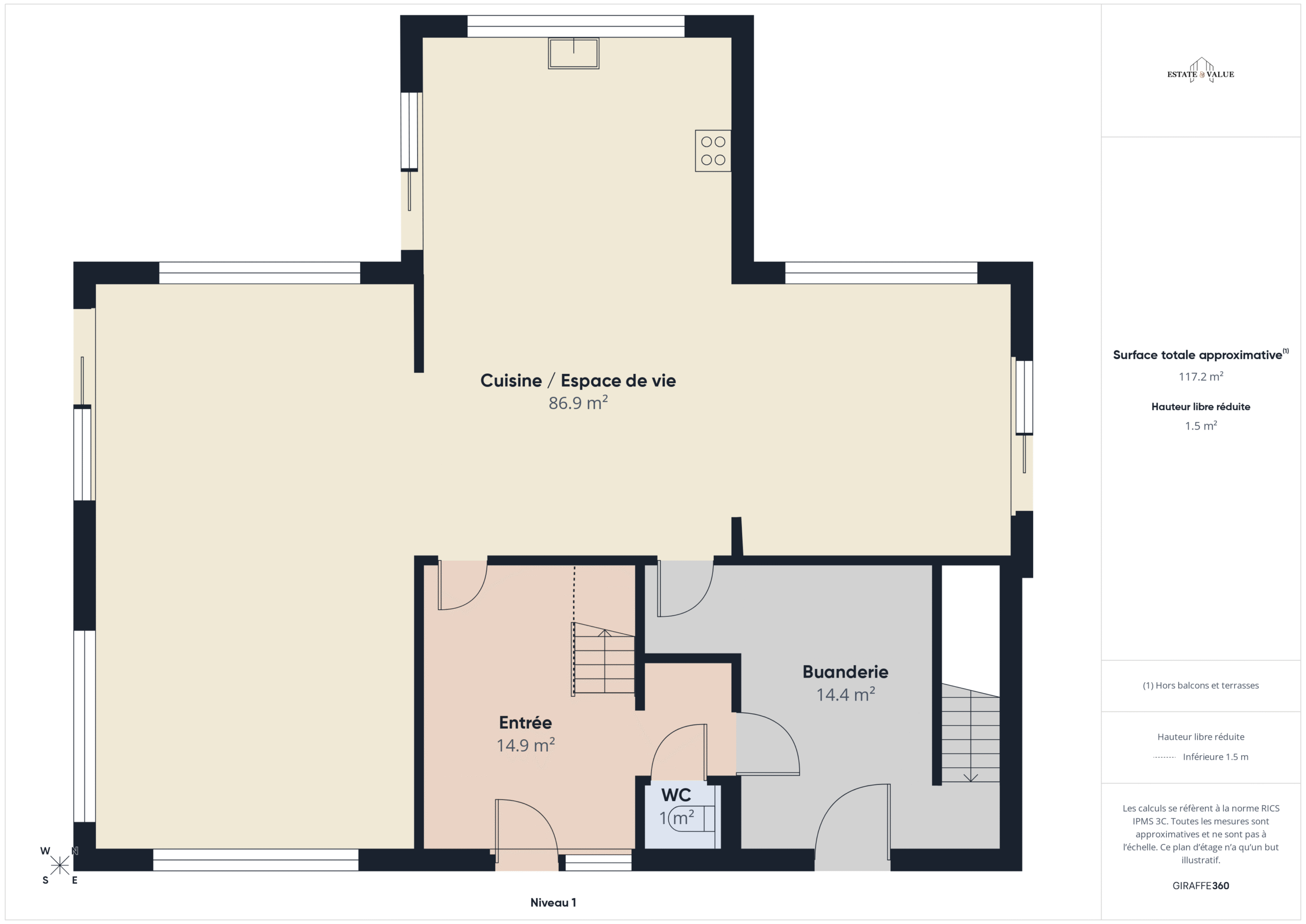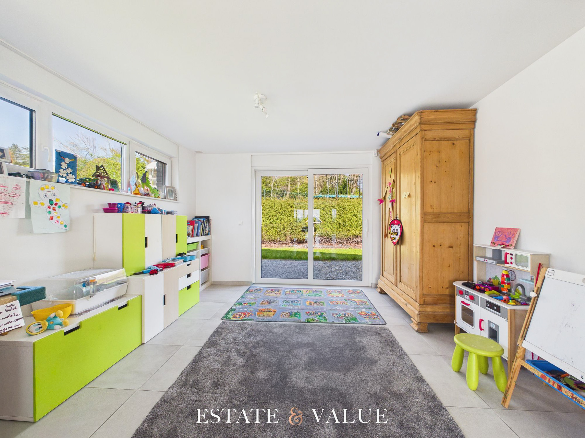 A l’étage de vie vous y trouvez le vaste séjour avec sa cuisine ouverte, une salle de jeux, une buanderie, le hall d’entrée et la toilette.