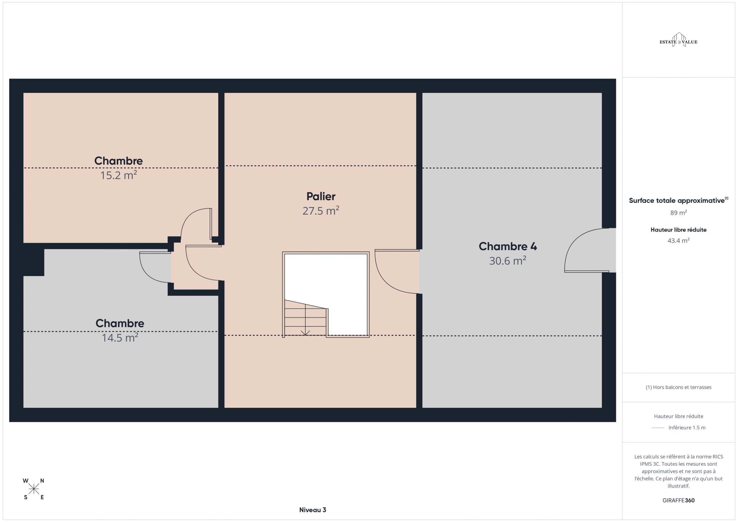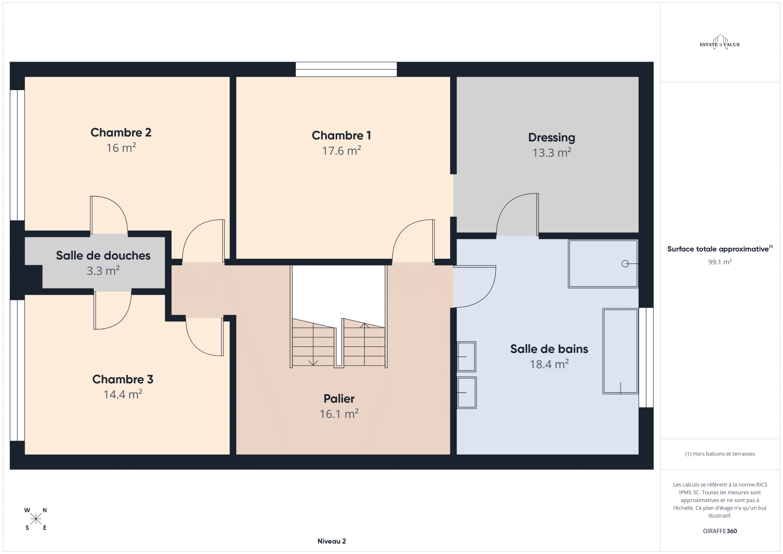 Le second étage propose trois chambres (dont une avec arrivées d’eaux et décharges).